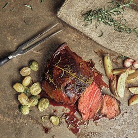 - Поместить в мясо термощуп и отправить в разогретый духовой шкаф. Установить темпертуру термощупа 57 градусов для мяса с кровью, 61 для средней прожарки или 68 - для полной.