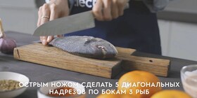 Используя острый нож, сделать 5 диагональных надрезов по бокам рыбы. Натереть йогуртовым соусом и убрать в холодильник.