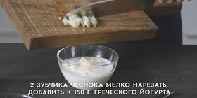 Зубчики чеснока очистить, раздавить ножом на волокна, мелко нарезать их. Смешать в отдельной миске греческий йогурт, кумин, кайенский перец и чеснок, добавить соль.