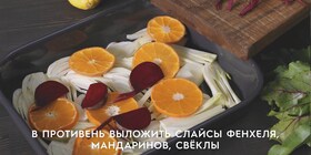В большой противень уложить слайсы фенхеля, свёклы, мандарины.