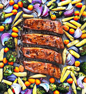 На противень простеленный пергаментом по краям выложить овощную смесь, а в центр выложить лосось посыпанный кунжутом и розовым перцем, и поставить в предварительно разогретую духовку на 180 градусов, в режим конвекция на 15 минут. При подаче посыпать нарезанным зеленым луком и долькой лимона.