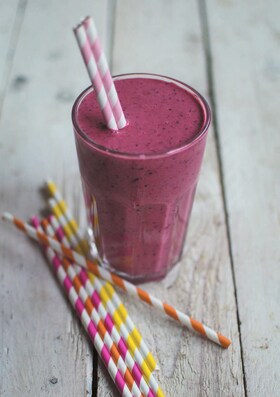 Фрукты, яблочный сок и мед помещаем в блендер и взбиваем до однородной массы. Если использовать замороженные фрукты, смузи получится гуще.
