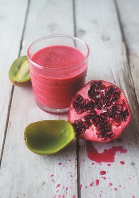 Выжимаем сок из граната. Киви очищаем и режем крупными кусочками. Имбирь очищаем от кожуры и размалываем.
