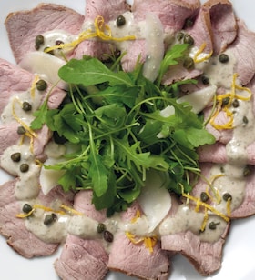 - Перед подачей полить нарезанное соусом мясо, затем украсить зеленью и каперсами.