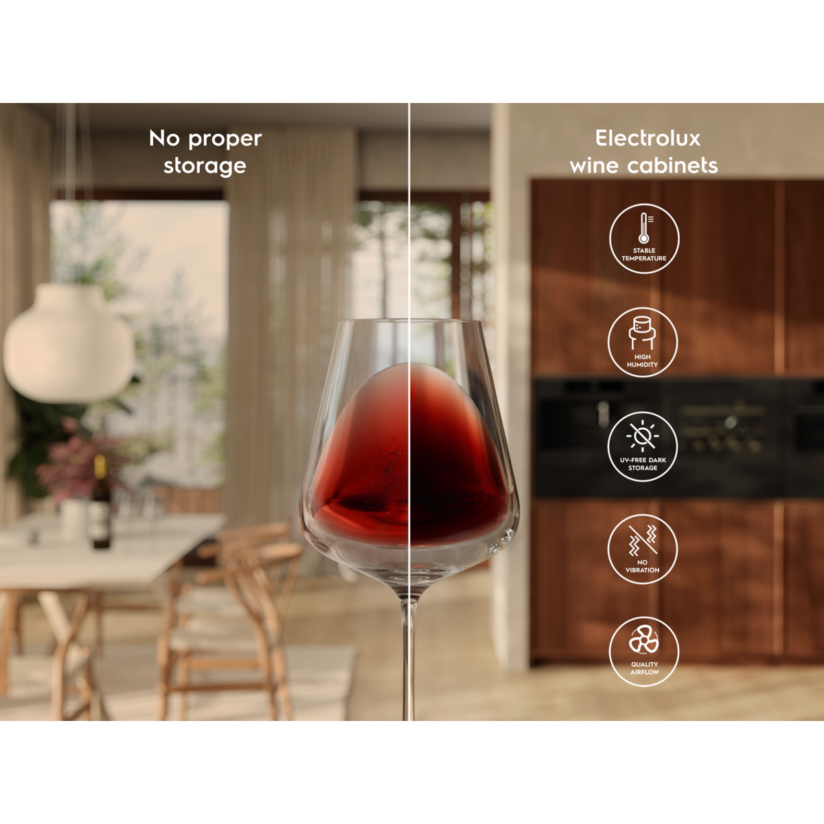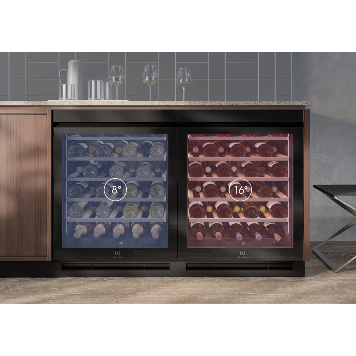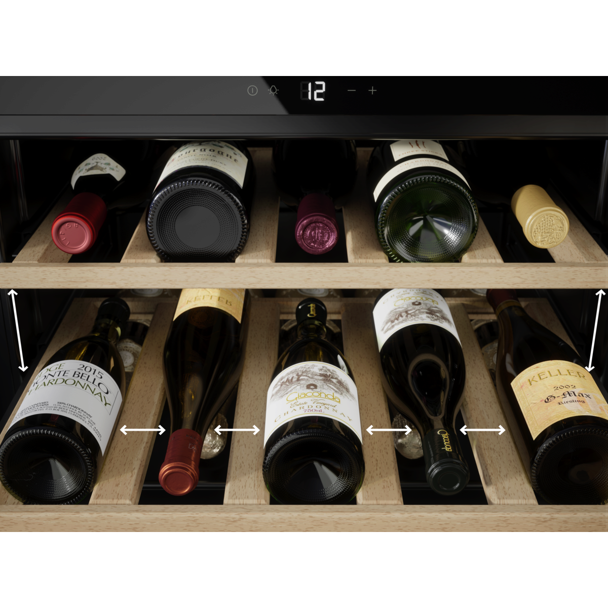Продемонструйте всю свою колекцію завдяки полицям для ідеального зберігання. Широкі полиці, деревина преміум-класу, телескопічні напрямні та оптимальний простір для розміщення всіх типів пляшок об'ємом 750 мл — навіть вашого улюбленого шампанського — без подряпин на етикетках