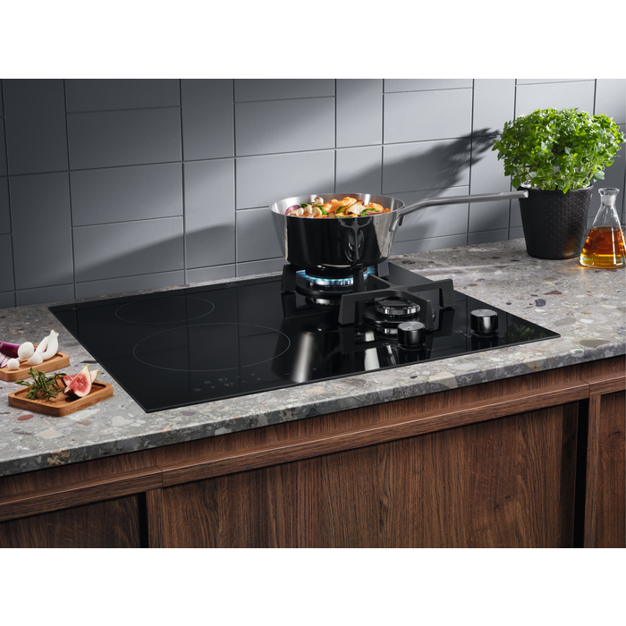 Ця комбінована плита має як індукційні зони нагрівання, так і газові конфорки, отже ви завжди зможете вибрати потрібне джерело нагрівання.