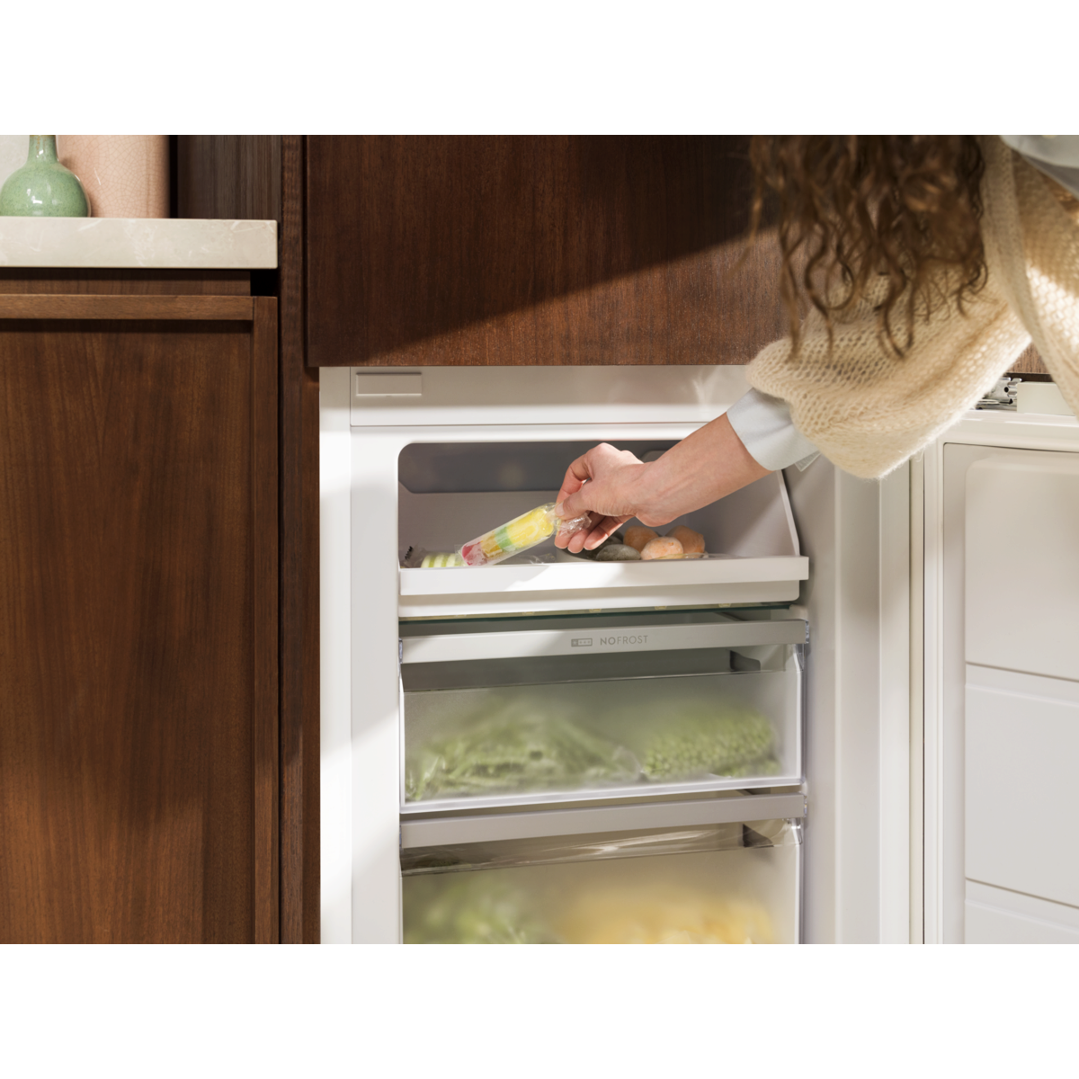 Холодильник із вбудованою морозильною камерою серії 600 Low Frost AI CoolAssist адаптується до вашого повсякденного життя. Незалежно від того, чи додаєте ви щойно куплені продукти чи вирушаєте у відпустку – технологія Low Frost зменшує утворення льоду для більш легкого обслуговування.