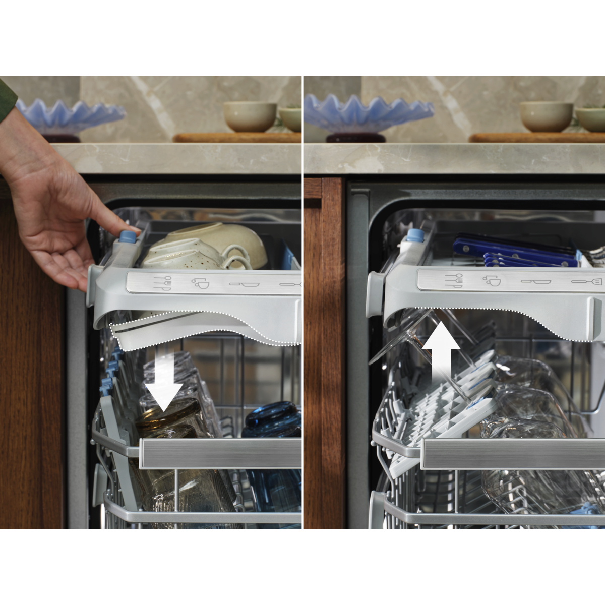 900 MaxiSpace на 5 см вища всередині, але вміщується під стандартну стільницю. Просторі універсальні кошики легко вміщують карафи, келихи і навіть супниці. Лоток для столових приборів підходить для невеликих чашок. Ефективна система очищення видаляє стійкі залишки їжі з мінімальними витратами води.