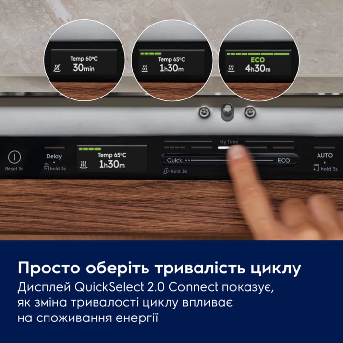 1 цикл, 2 зони. Інтенсивне миття каструль та сковорідок, дбайливе – для скла