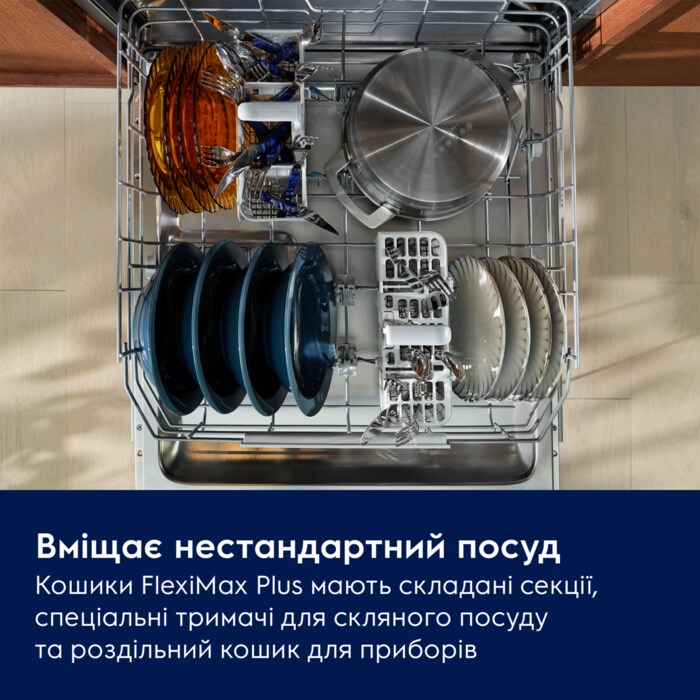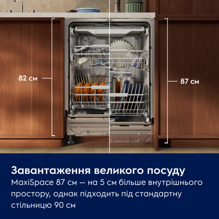 Серія 800 MaxiSpace має внутрішній простір вищий на 5 см і при цьому легко стає під стандартною кухонною стільницею. Потужне миття видаляє стійкі залишки їжі, а гнучкі кошики з тримачами, що легко висуваються, надійно утримують скляний посуд. Мінімальне використання води – всього 8,4 літра.