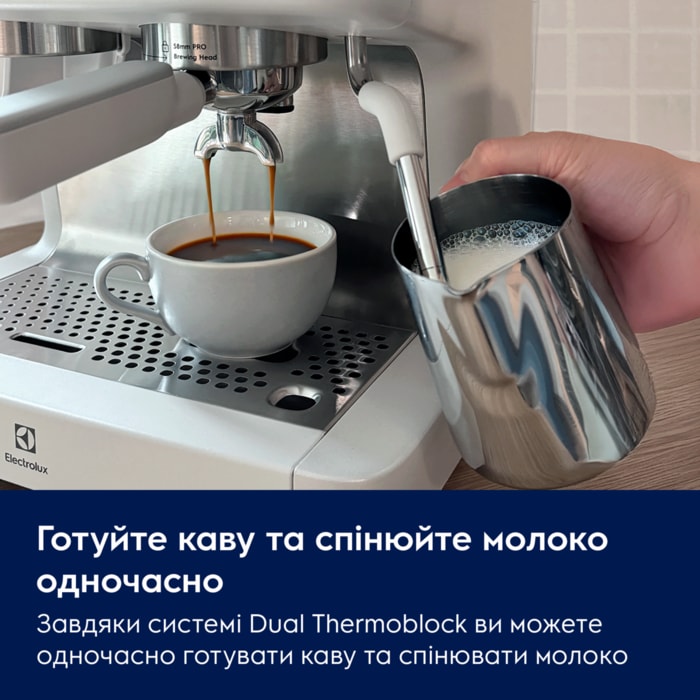 Технологія Dual Thermoblock забезпечує постійну температуру заварювання та готування з використанням пари. Ефективна система нагрівання дає змогу одночасно готувати еспресо та спінювати молоко, аби насолоджуватися свіжозвареною кавою без довгого очікування.