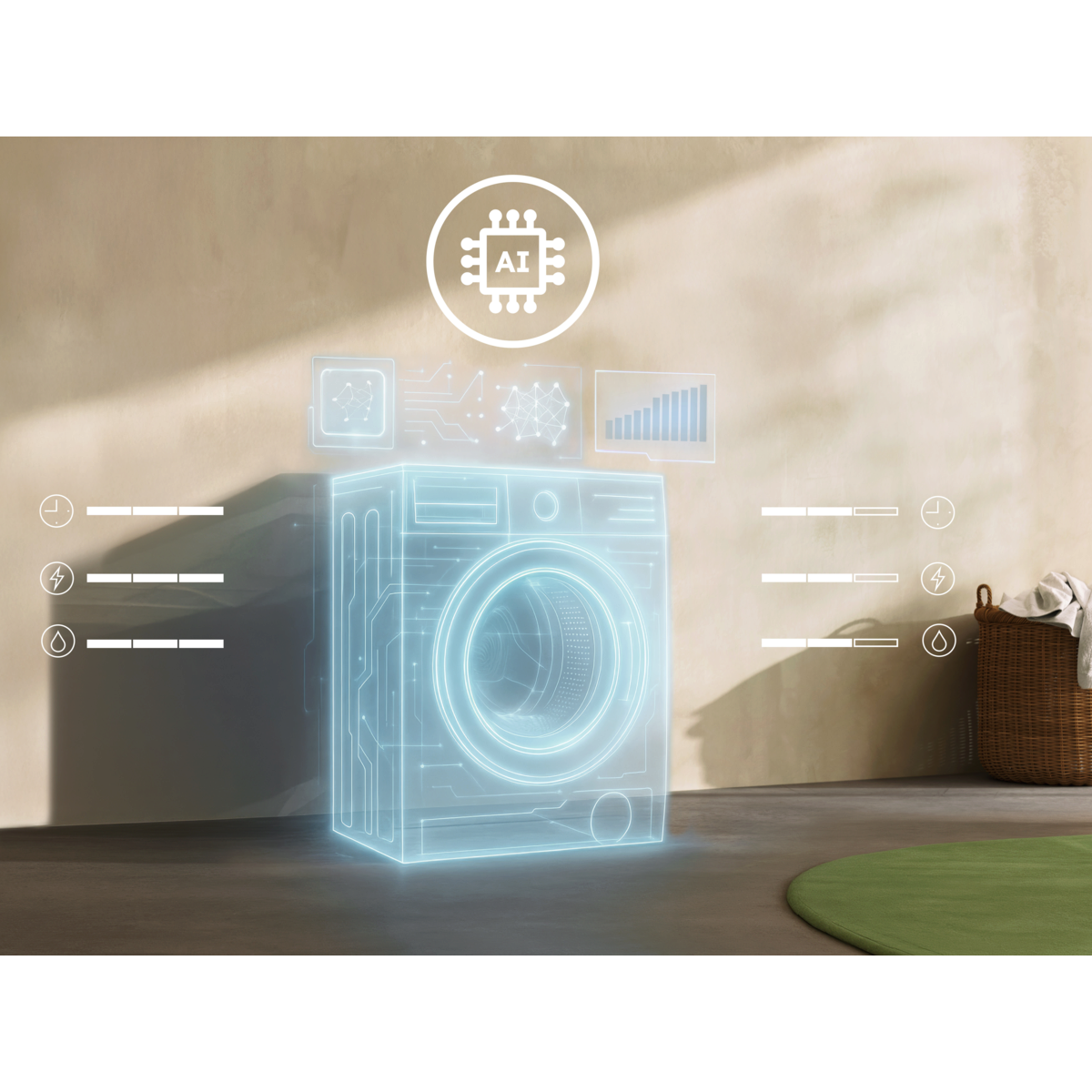 * На основі алгоритму визначення ваги завантаження, навченому на різних типах тканин. Дані користувачів не використовуються для подальшого навчання ШІ. ** Внутрішній тест циклу «Бавовна 30°C» з AI WashAssist: порівняння 1 кг і максимального завантаження за часом, водою та енергією.