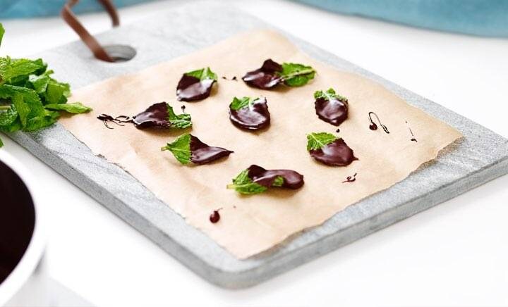 Для освіжаючого завершення обіду побавте свої рецептори цим простим частуванням — заморожені листя м'яти у шоколаді. Вони смачні як самі по собі, так і в якості додатку до інших десертів, наприклад, морозива і тістечок. Розтопити шоколад поступовим нагріванням на індукційній варильній поверхні дуже просто: професійного результату можна досягнути без складних водяних бань. Чому б не спробувати інше листя для нового досвіду? Ми пропонуємо базилік, шавлію і квіти лаванди.