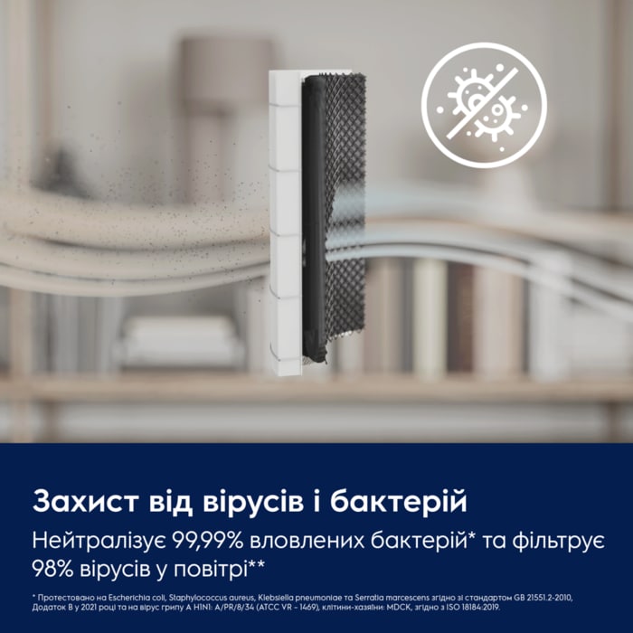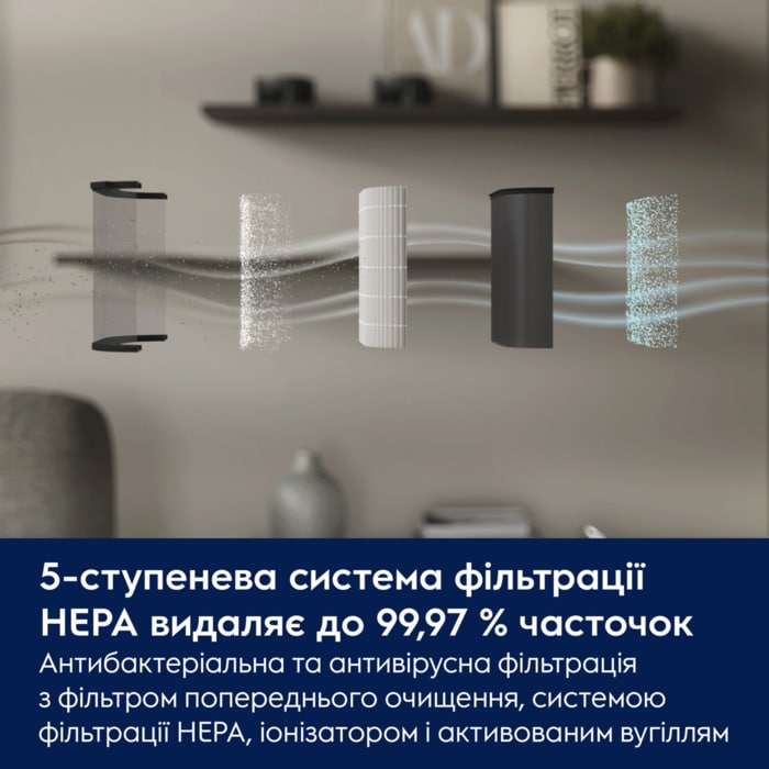 Забезпечте виняткову фільтрацію дрібних частинок з використанням технології 360 HEPA13, щоб значно скоротити кількість забруднюючих речовин PM2,5 та запахів у вашій оселі, а вставка з активованим вугіллям допомагає видалити запахи.