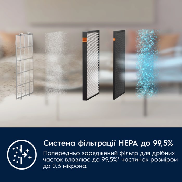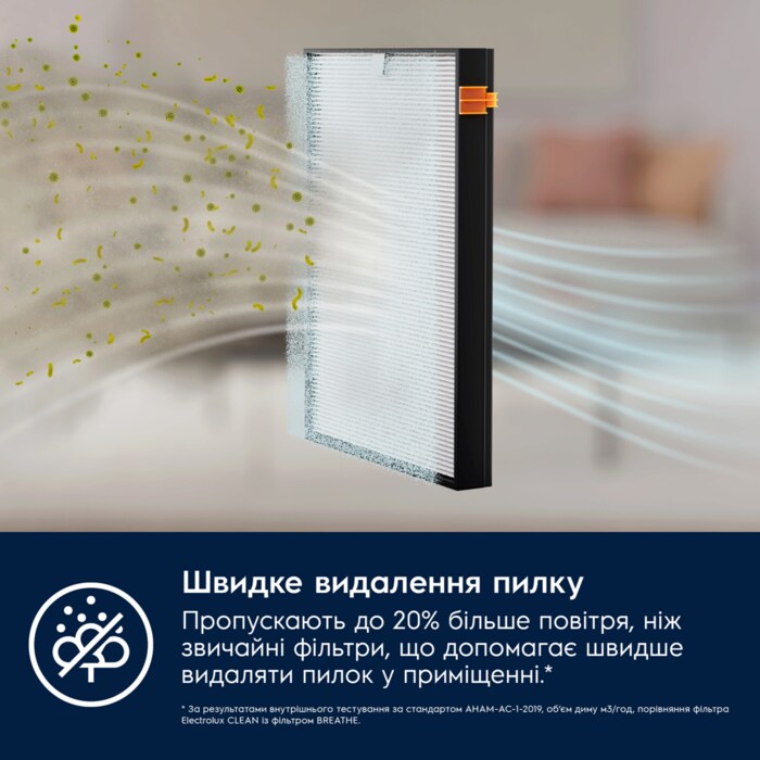 *Внутрішні випробування згідно зі стандартом AHAM-AC-1-2019, задимлення м3/год, при порівнянні фільтра CLEAN із фільтром BREATHE від Electrolux.