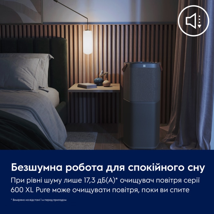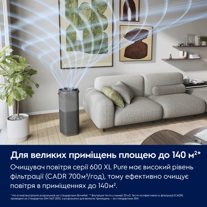 Ідеальне рішення для великих приміщень: Pure 600 XL із коефіцієнтом CADR 700** очищує повітря в кімнаті площею 145 м2*** лише за 3,2 хвилини* завдяки спіральному спрямуванню повітря потужною системою AirSurround. Фільтр з активованого вугілля нейтралізує формальдегід та інші ЛОС.